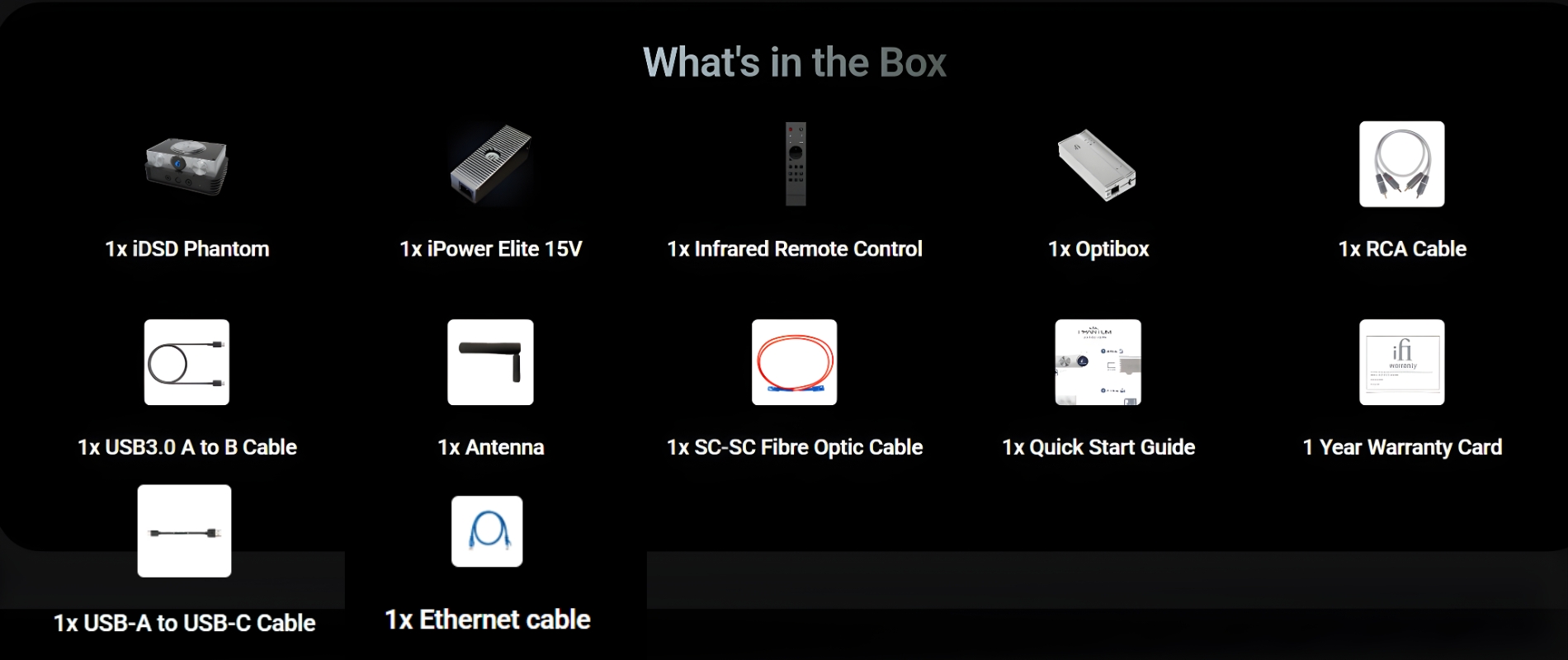 Khi mua iFi iDSD Phantom, người dùng sẽ nhận đầy đủ phụ kiện chính hãng trong hộp, sẵn sàng sử dụng ngay: