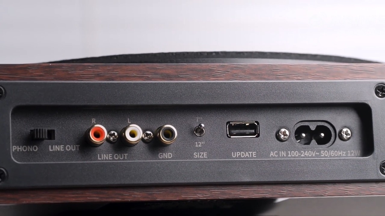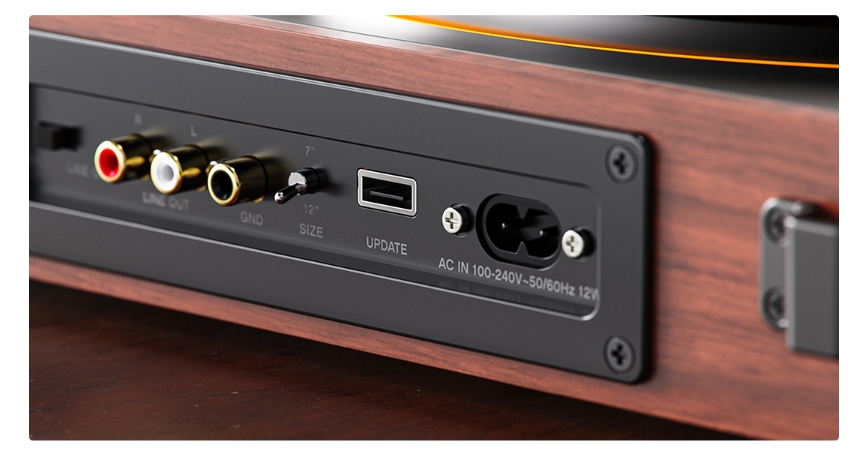 Hệ thống cổng kết nối bao gồm: Line Out RCA (L/R), Phono Out RCA, Ground terminal, USB-A (nâng cấp firmware)