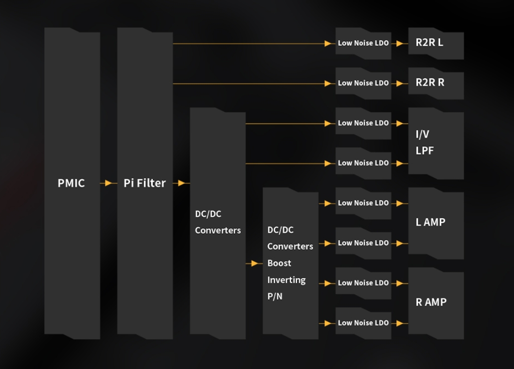 Nguồn cấp được tách riêng giữa khối digital và analog, trong đó riêng phần analog có ba đường nguồn độc lập cho DAC, pre-amp và amp nhằm đảm bảo độ tinh khiết của tín hiệu. Khi kích hoạt Super High Gain Mode, máy mở khóa đường điện áp cao để đạt công suất tối đa, còn Desktop Mode cho phép bypass pin khi dùng nguồn ngoài, giảm chu kỳ sạc xả và duy trì hiệu năng ổn định khi sử dụng như DAC/AMP để bàn.