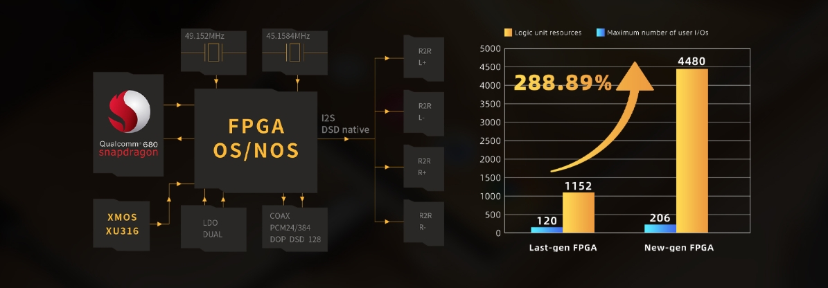 Thay vì sử dụng chip DAC tích hợp, FiiO M33 R2R sử dụng mạch DAC R2R fully discrete 4 kênh với tổng cộng 192 điện trở thin-film độ chính xác 0.1% và độ trôi nhiệt cực thấp, cấu trúc vi sai toàn phần giúp giảm nhiễu, tăng dải động và cải thiện độ tách kênh. Kiến trúc này mang lại chất âm mượt, dày, giàu năng lượng hài âm, sân khấu rộng và khả năng tái tạo nhạc tính đặc trưng của R2R nhưng vẫn giữ được độ cân bằng và kiểm soát của các nguồn phát hi-end hiện đại. Toàn bộ tín hiệu số được xử lý thông qua hệ thống DAPS với chip FPGA chuyên dụng và bộ dao động tinh thể femtosecond kép cung cấp xung clock thống nhất siêu chính xác, giảm jitter xuống mức cực thấp và cải thiện đáng kể hiệu suất xử lý so với thế hệ trước.