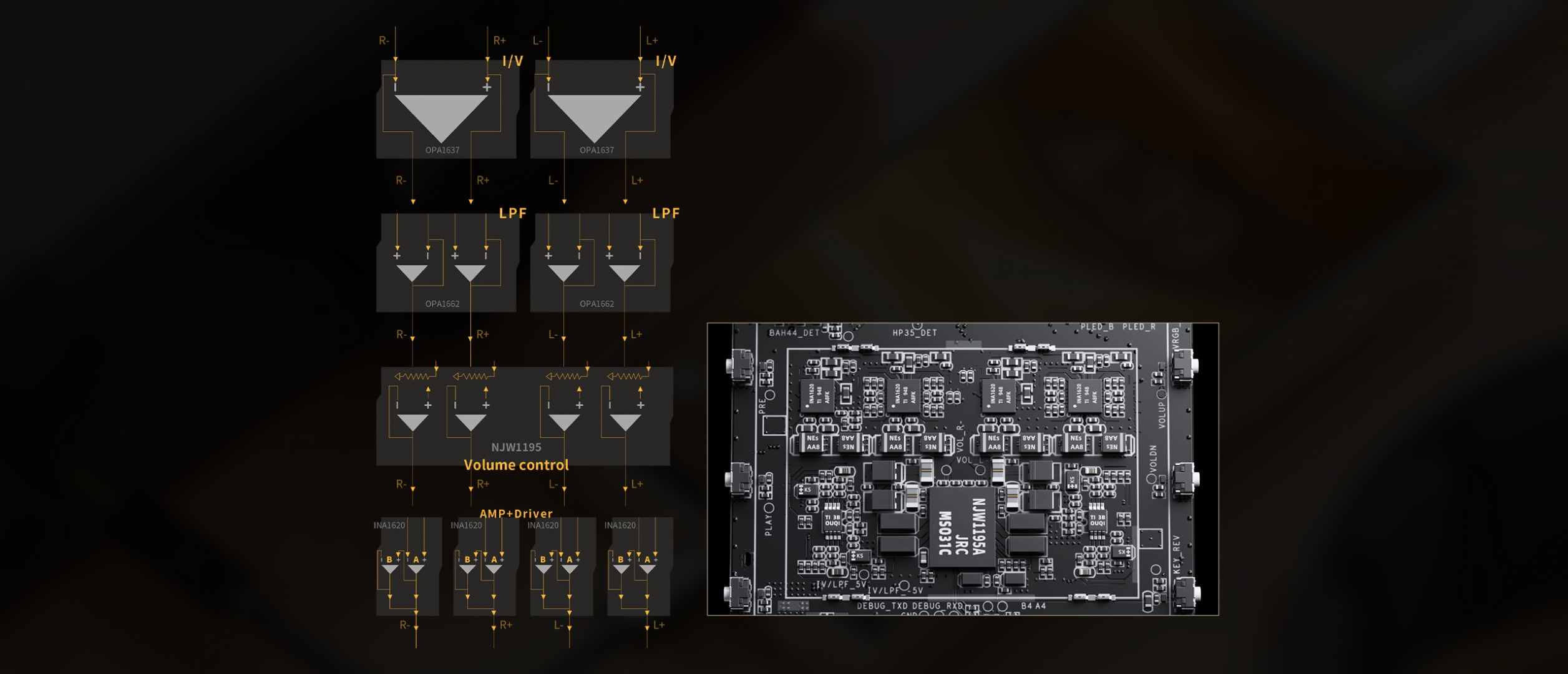 Toàn bộ phần analog của máy được xây dựng theo kiến trúc amp desktop thu nhỏ với linh kiện audio cao cấp từ Texas Instruments. Tầng chuyển đổi dòng – áp và tiền khuếch đại sử dụng 2 chip op-amp vi sai TI OPA1637, trong khi tầng công suất trang bị 4 chip khuếch đại tai nghe TI INA1620 mắc song song nhằm tăng dòng, giảm méo và cải thiện khả năng kiểm soát driver. Hệ thống còn tích hợp chip điều khiển âm lượng NJW1195A độ chính xác cao, 8 tụ film Rubycon cho dải trung tự nhiên và MOSFET dòng lớn 65A giúp cấp nguồn hiệu quả. Nhờ thiết kế này, FiiO M33 R2R đạt công suất lên đến 1100mW + 1100mW ở cổng balanced 4.4mm và 470mW + 470mW ở cổng 3.5mm, đủ khả năng kéo từ IEM nhạy cho đến tai nghe full-size trở kháng cao.