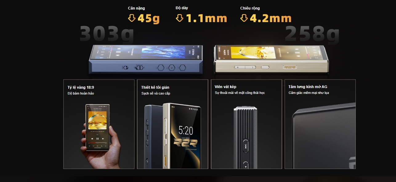 FiiO M33 R2R sở hữu màn hình 5.5 inch độ phân giải 1080 × 2160, ép kính hoàn toàn, bảo vệ bởi Corning Gorilla Glass 3 và lớp phủ oleophobic, hiển thị sắc nét và thao tác mượt mà. Thân máy sử dụng tỷ lệ 18:9 cho cảm giác cầm nắm tự nhiên, mặt lưng kính mờ AG chống bám vân tay và trọng lượng chỉ 258g, mang lại sự cân bằng giữa tính di động và cảm giác cao cấp. Giao diện mới với VU meter, spectrum và cassette UI tạo trải nghiệm nghe nhạc giàu cảm xúc hơn.