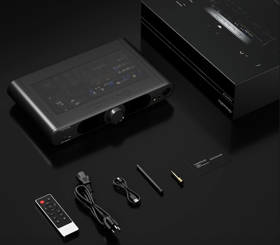 DX9 Discrete sở hữu khung nhôm CNC nguyên khối, mặt kính trong suốt giúp quan sát phần mạch bên trong. Mặt trước được trang bị hai màn hình màu với giao diện Aurora UI, hiển thị FFT spectrum và VU meter theo thời gian thực. Thiết bị đi kèm núm xoay đa chức năng và remote điều khiển từ xa, thuận tiện trong quá trình sử dụng.