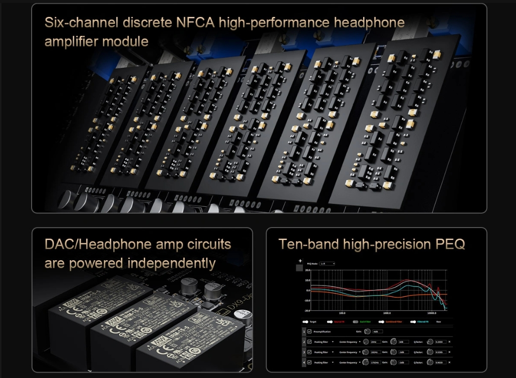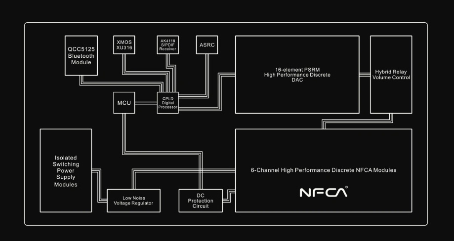 Bên cạnh DAC mới, DX9 Discrete còn được trang bị module khuếch đại tai nghe NFCA discrete fully balanced, gồm 6 kênh khuếch đại độc lập. Thiết kế này giúp đảm bảo khả năng vận hành ổn định và kiểm soát tải tốt ngay cả với các tai nghe khó kéo.