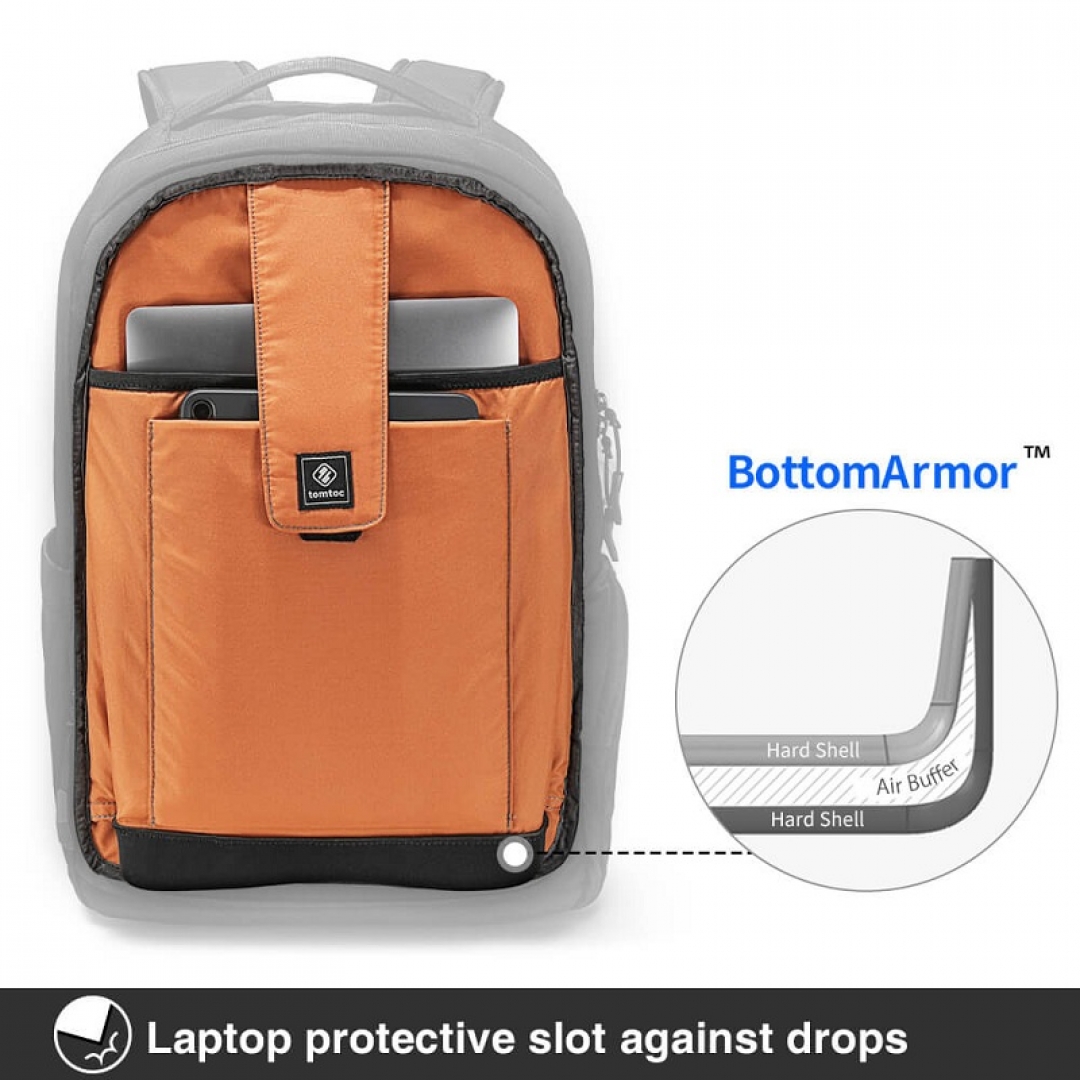 Công nghệ sáng chế tiên tiến của bottomArmor: Dưới cùng của ngăn đựng máy tính xách tay, được làm bằng các lớp vỏ cứng kép với bộ đệm không khí ở giữa, bảo vệ máy tính xách tay của bạn khi rơi và va chạm