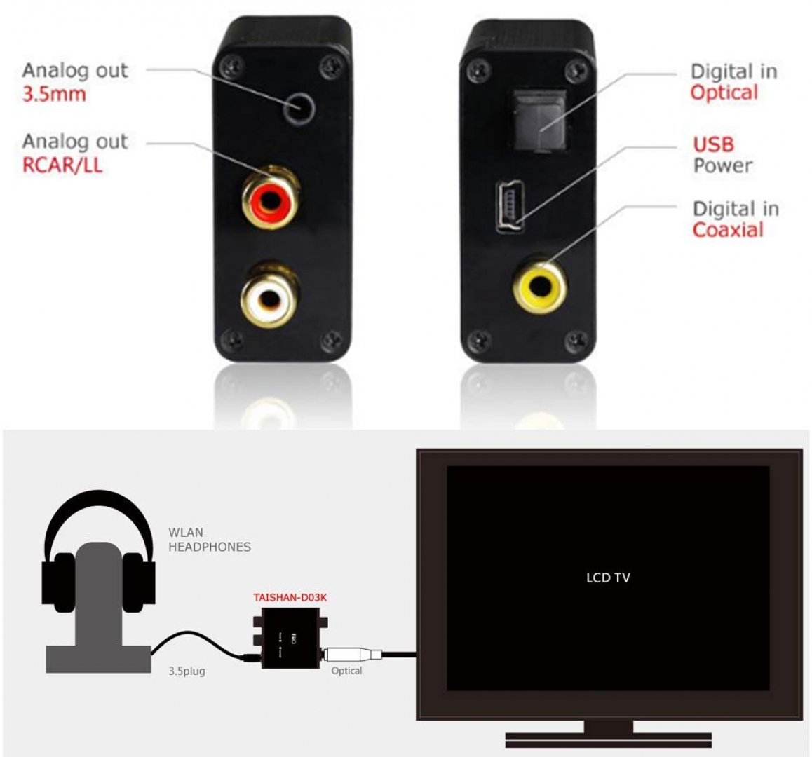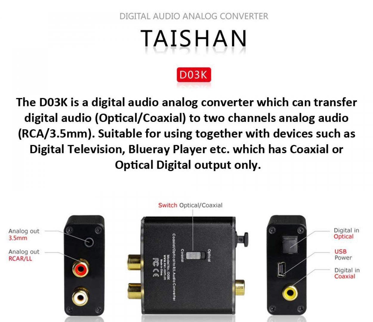 - Chuyển đổi tín hiệu đầu vào qua cổng quang ra Analog (RCA & Audio 3.5mm).