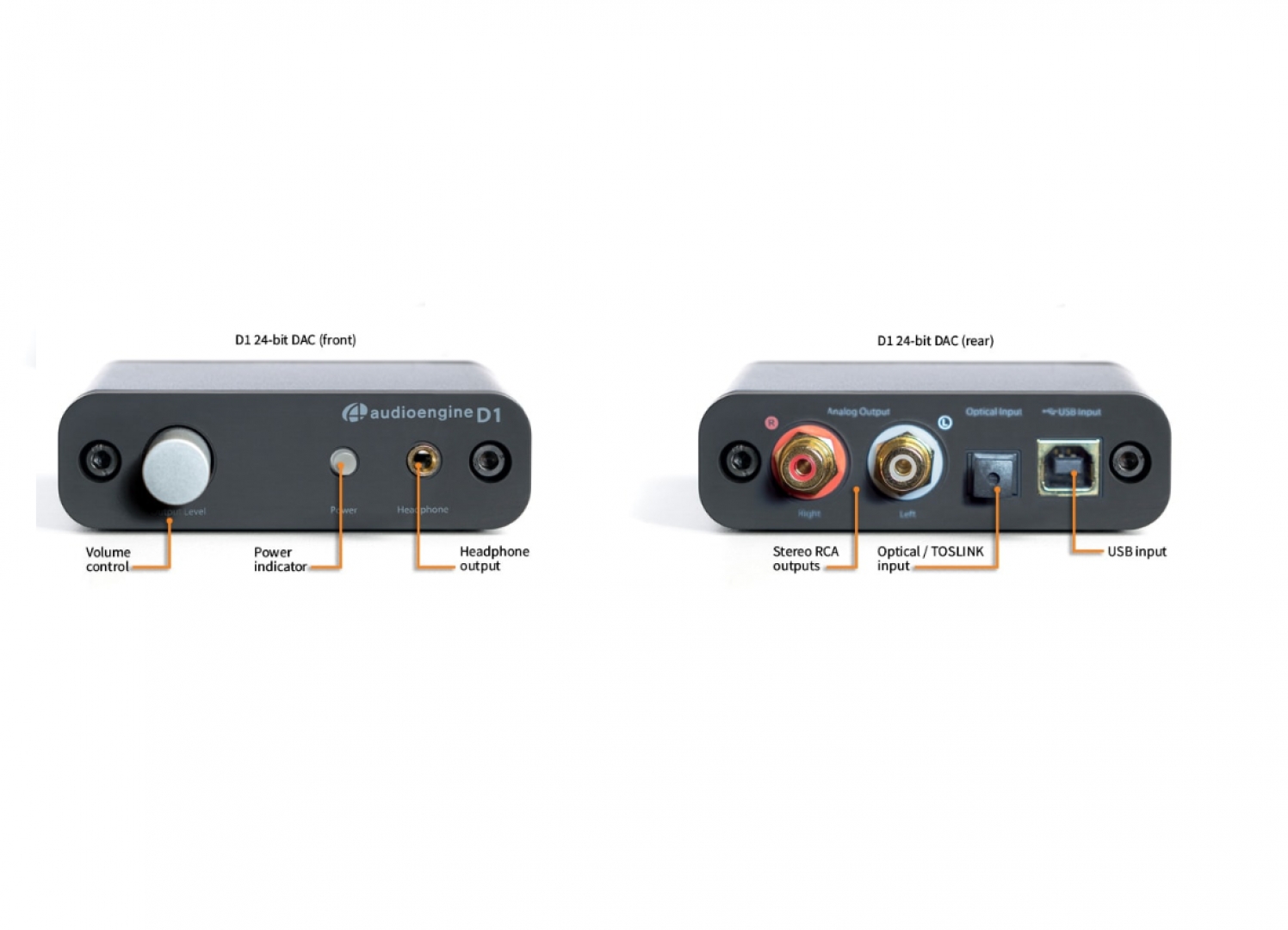 Mặt trước thiết bị là nút chỉnh âm lượng đầu ra, đèn LED trắng báo trạng thái hoạt động kiêm nút bật/tắt nguồn và ngõ cắm headphone loại 3,5mm. Mặt sau Audioengine D1 là ngõ xuất tín hiệu âm thanh RCA dành cho kết nối với loa rời cùng 2 ngõ vào tín hiệu âm thanh số.
