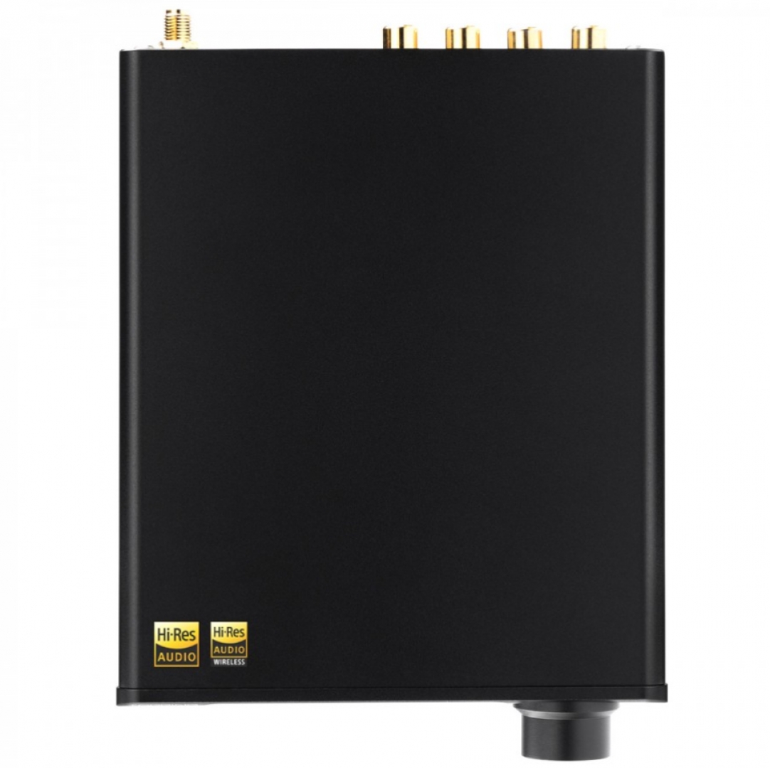 Mặt trước của DAC/AMP để bàn này được trang bị một màn hình LED hiển thị độ phân giải cao, một đầu ra amp tai nghe 3.5mm và một núm xoay điều khiển. Mặt sau bao gồm: USB-B, cổng quang Toslink, hai cổng S/PDIF Coaxial, .. và một ăng-ten Bluetooth. Trong khi đó mặt trên xuất hiện các nhãn dán “Âm thanh độ phân giải cao” – một nhãn dành cho DAC Hi-res tiêu chuẩn còn nhãn khác dành cho Hi-res không dây aptX-HD và LDAC.