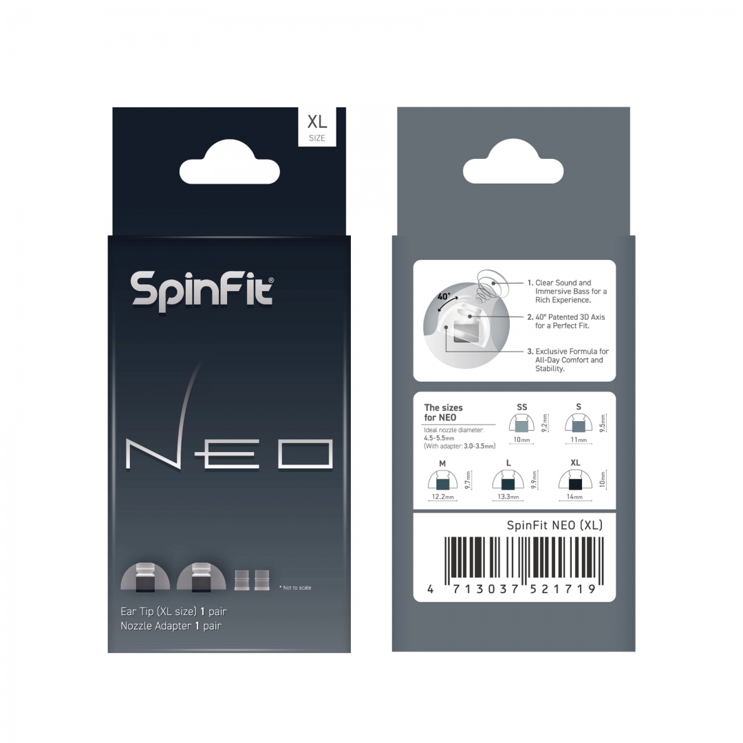 SpinFit Neo có đầy đủ 5 kích cỡ (SS, S, M, L, XL) giúp người dùng dễ dàng chọn lựa size phù hợp với ống tai.