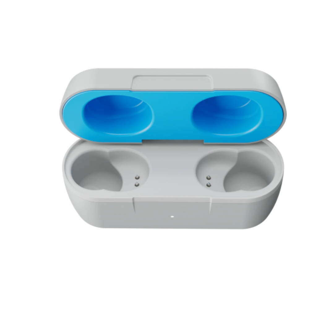 Hộp sạc của tai nghe skullcandy jib tws cũng được thu gọn lại, vẫn sở hữu kiểu dáng đóng mở dạng vỏ sò rất dễ dàng đóng mở bằng một tay đồng thời giúp cho người dùng có thể dễ dàng cầm nắm gói gọn trong lòng bàn tay cũng như không hề chiếm quá nhiều diện tích khi sử dụng. Như các hộp trước của skullcandy thì ta có thể dễ dàng thấy logo đầu sọ skullcandy trên hộp và ở trên tai nghe.