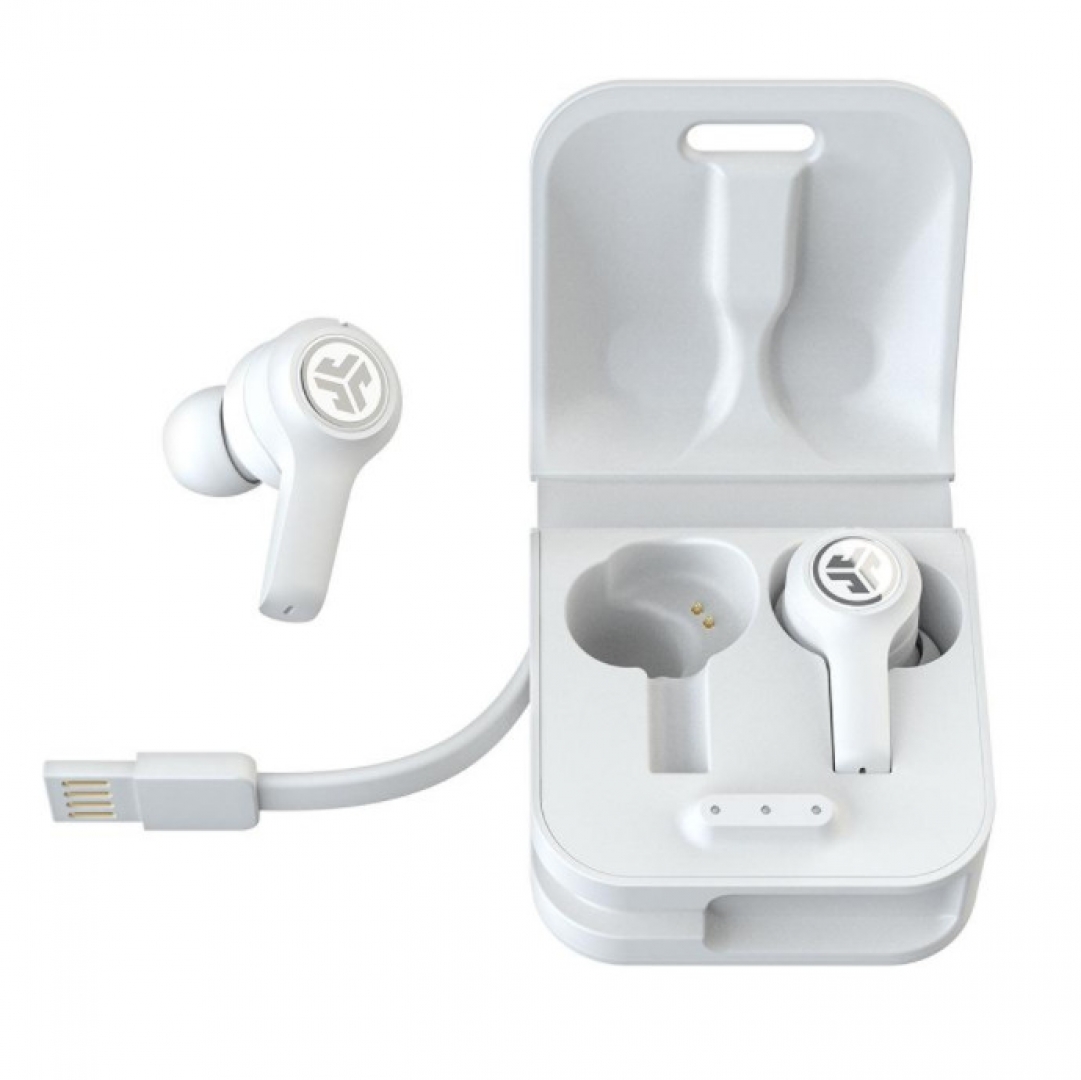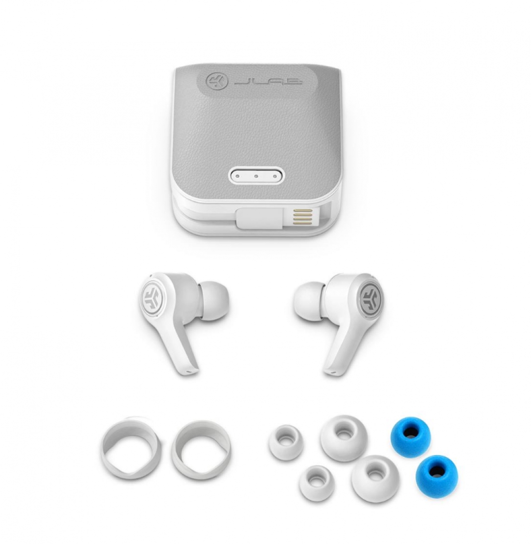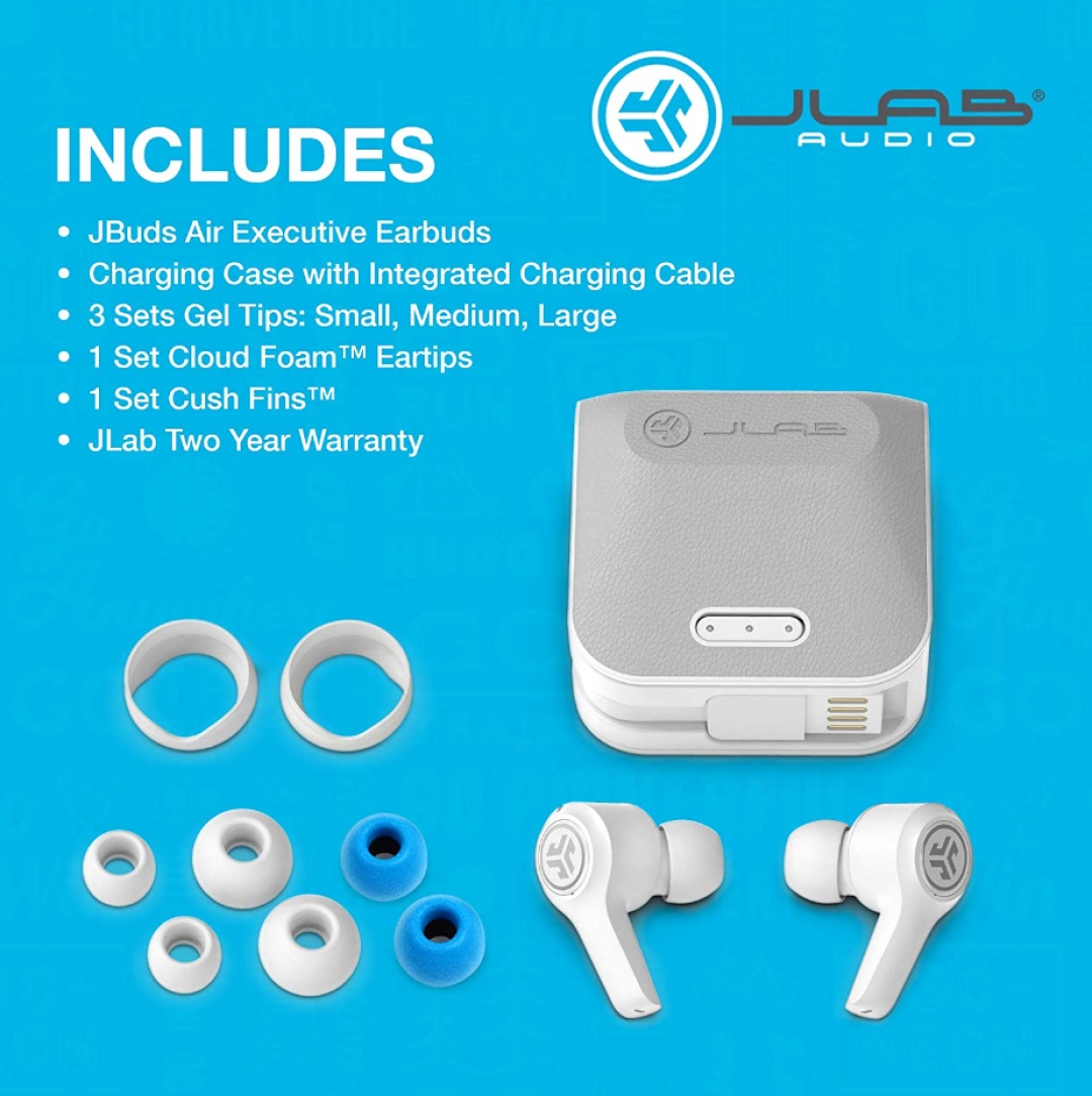 INCLUDES: JBuds Air Executive True Wireless Earbuds, Charging Case with Integrated Charging Cable, 3 Sets Gel Tips, 1 Set Cloud Foam™ Eartips, 1 Set Cush Fins™, JLab Two Year Warranty.
