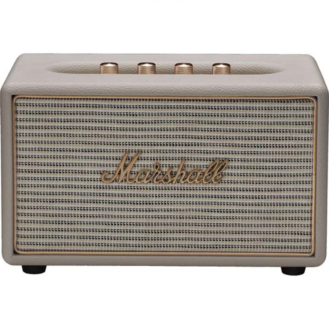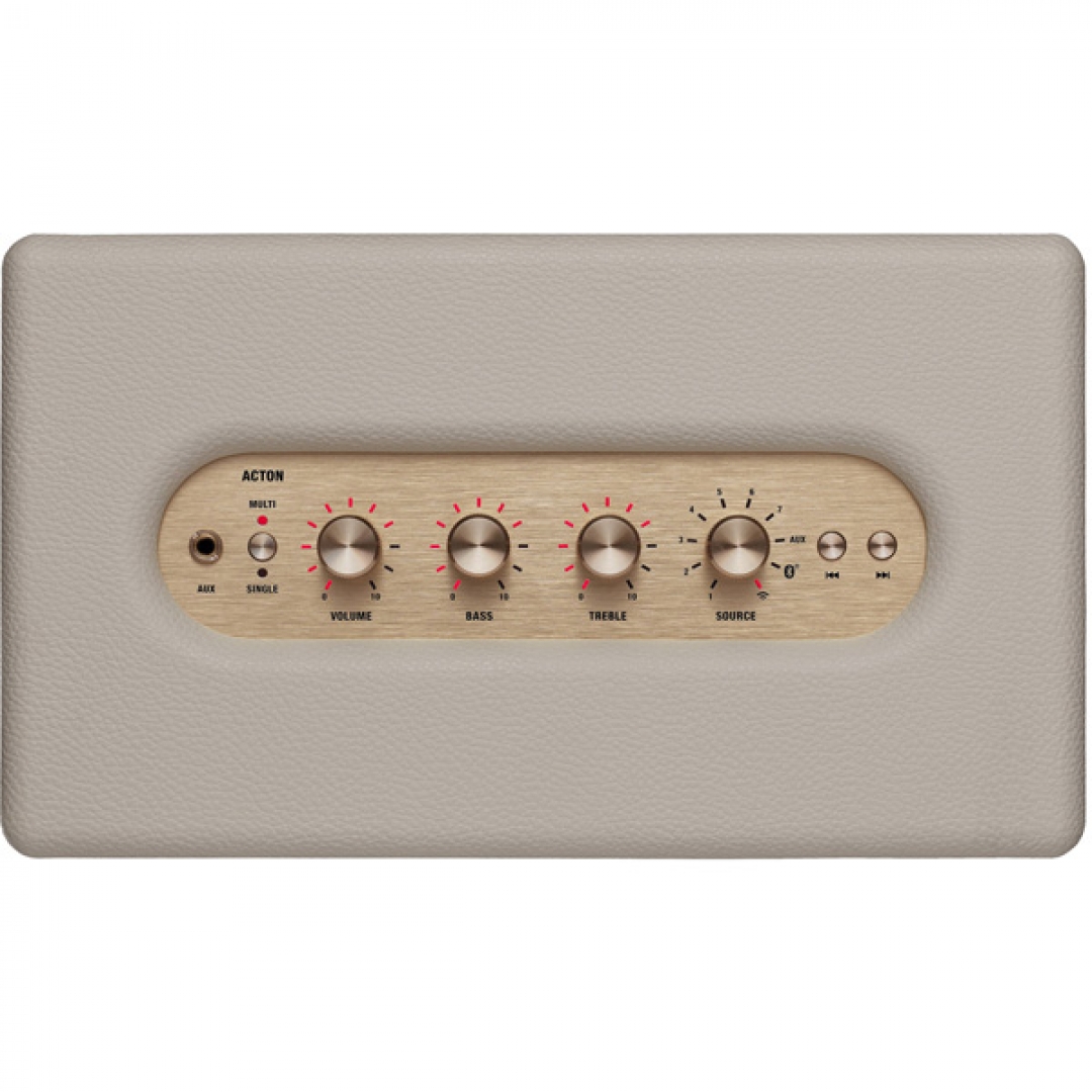 Toàn bộ mặt ngoài của loa được trang bị lớp vỏ nhựa cao cấp tạo vân giống bọc da, tên thương hiệu Marshall được mạ vàng nổi bật ở mặt trước của sản phẩm, các chi tiết được làm khá công phu, tổng quan tạo sự hài hòa, bụi bặm nhưng không kém phần mạnh mẽ. Phía trên của Marshall Acton Multi Room là khu vực các nút chức năng, hệ thống đèn LED báo hiệu hoạt động và cổng vào 3.5 mm.