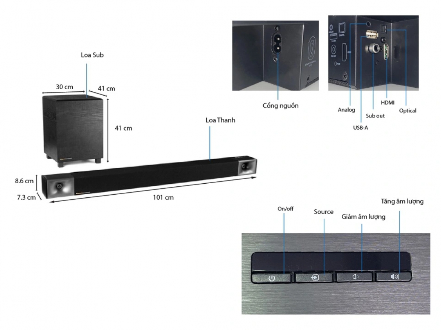 Kích thước loa thanh: 101 x 7.3 x 8.6 cm
