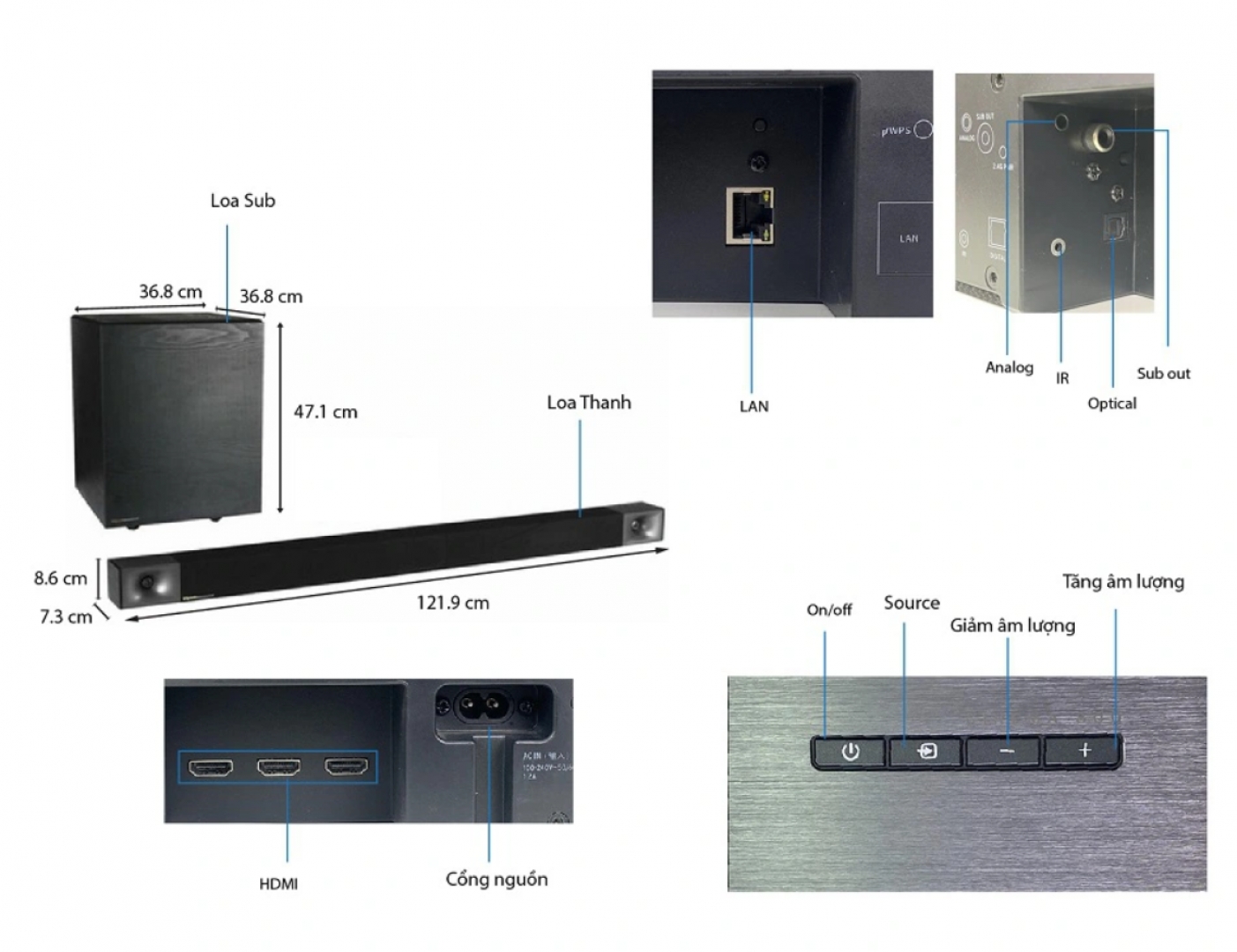 Có tất cả những gì chúng ta cần để kết nối TV và những thiết bị ngoại vi: cổng Digital như Optical và HDMI, thêm cổng Analong kết nối bằng jack 3.5, đường vào RJ45 kết nối Ethernet Hoặc có thể kết nối mạng bằng đường truyền wifi.