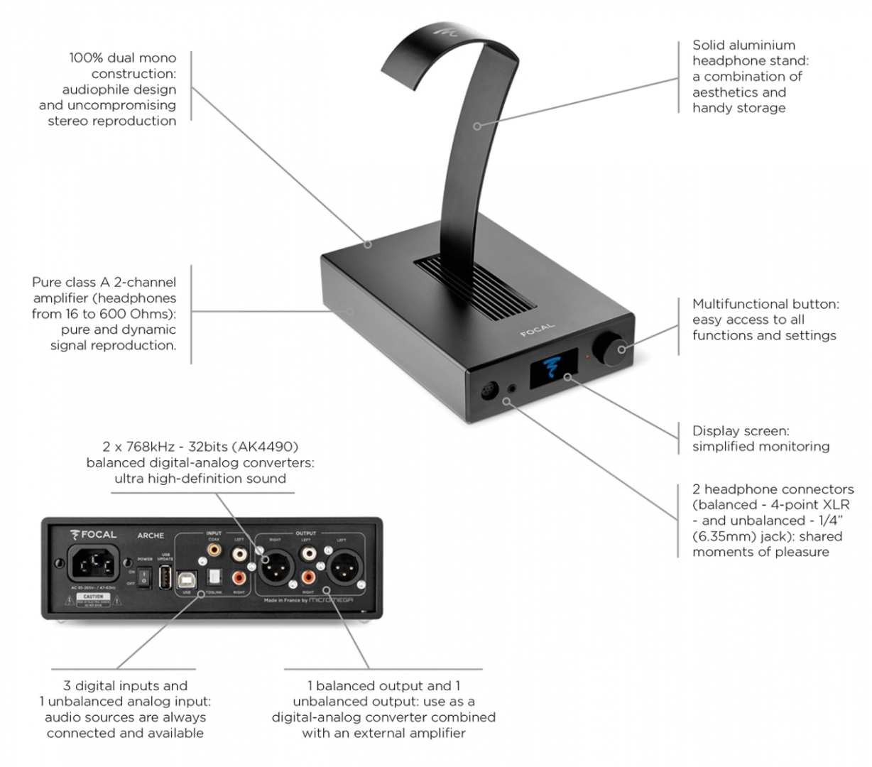 Focal has established itself as a key player in the high-end headphones market. The brand completes its high-fidelity Headphone Collection with Arche, an electronic associated solution to amplify your songs and your emotions. Thanks to the digital-analog converter and the pure class A amplification modes designed especially for headphones it integrates, Arche ensures an exceptional sound quality throughout your listening session.