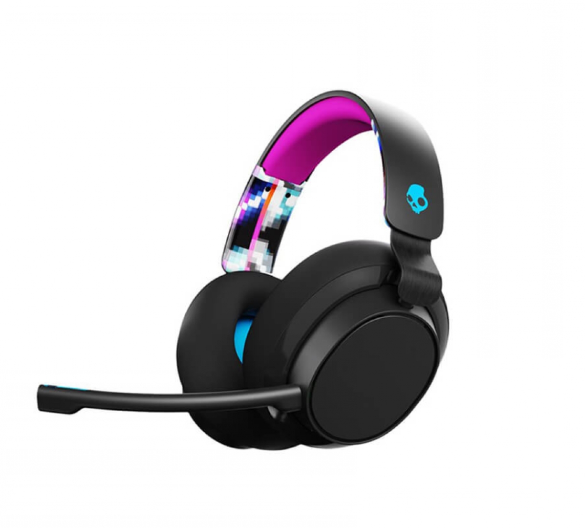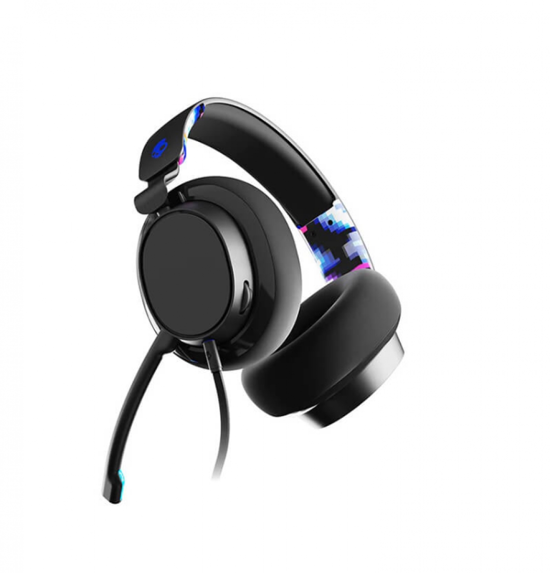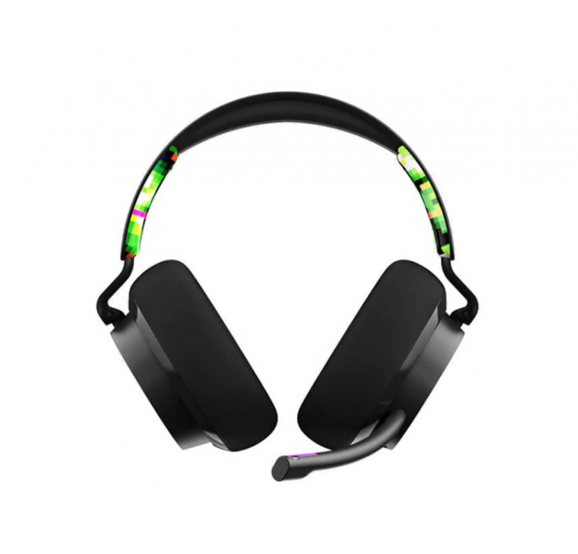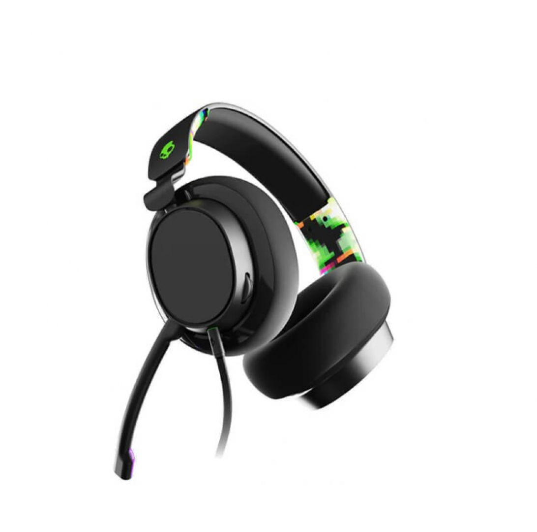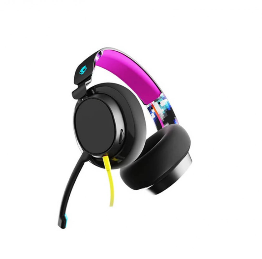 Các họa tiết “Digihype” rực rỡ trên headband giống như nét chấm phá cho vẻ đẹp của Slyr. Không thể thiếu đó là logo đầu lâu quen thuộc, cho phép người dùng nhận diện thương hiệu dễ dàng. Chụp tai bên trái có nút nhấn để tắt tiếng, một núm xoay âm lượng, đầu cắm cáp AUX và micro có thể tháo rời.