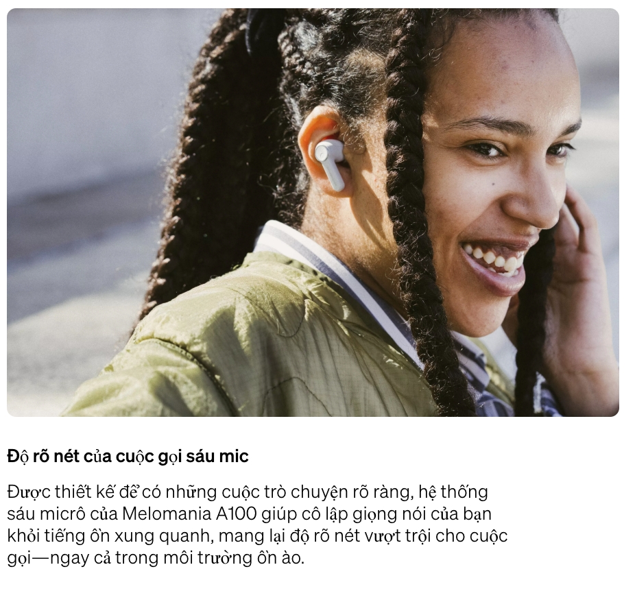 Trang bị micro kép kết hợp công nghệ Qualcomm® cVc™ noise cancellation, Melomania A100 mang lại chất lượng đàm thoại trong trẻo, loại bỏ tiếng ồn xung quanh, giúp bạn luôn rõ ràng trong mọi cuộc gọi.