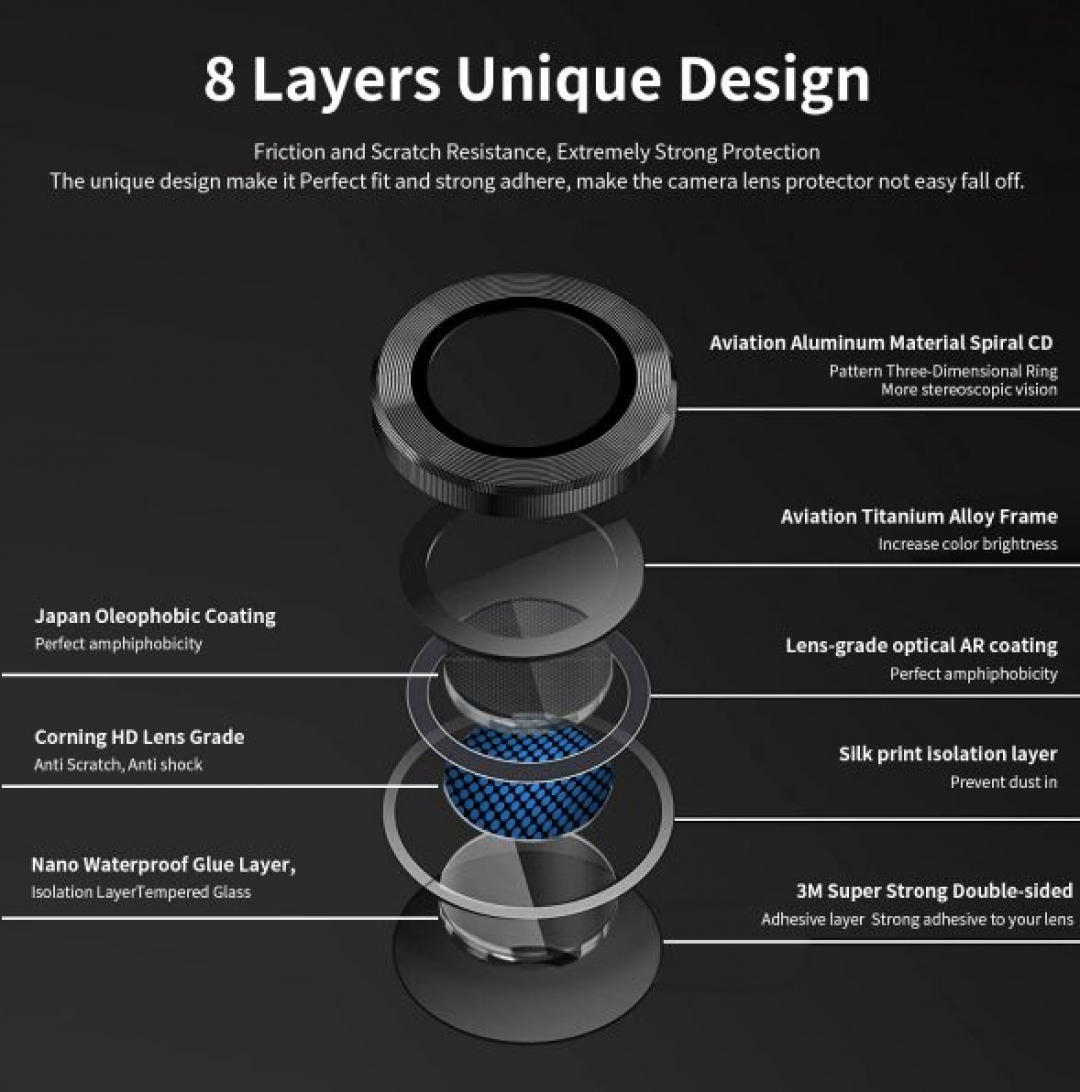 Lens camera DiamondShield được thiết kế bằng công nghệ hiện đại nhất với nhiều layers mang đến chất lượng chống va đập tốt nhất: